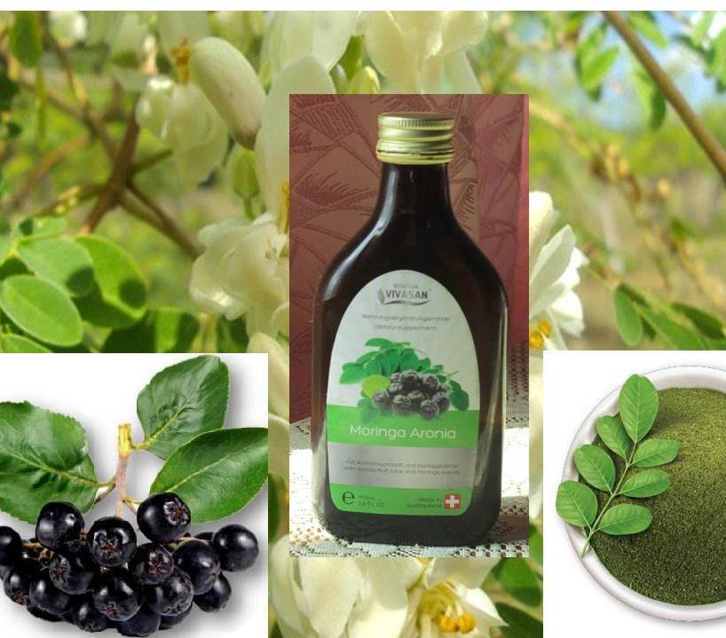 Арония (сок ягод черноплодной рябины) имеет высокое содержание активных веществ, таких как флавоноиды и антоцианы, богата витаминами K, C, фолиевой кислотой. Арония хорошо борется с патогенными микроорганизмами. Растение благотворно влияет на работу печени и эндокринной системы.Вместе оба растения моринга и арония дают супер-комбинацию натуральных витаминов – особенно витамина С и антиоксидантов. Синергия их с натуральными концентратами соков яблока и лимона, а также с экстрактом плодов фенхеля показала наилучший результат воздействия на иммунную,эндокринную, сердечно-сосудистую системы и ЖКТ.